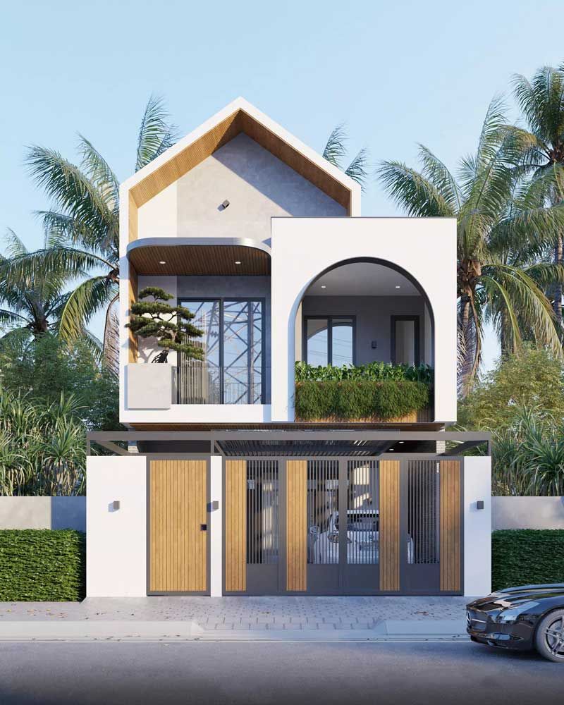- Màu sắc: tông trung tính (xám, trắng, be), điểm nhấn màu gỗ hoặc đen mờ cho khung cửa, lan can.