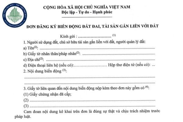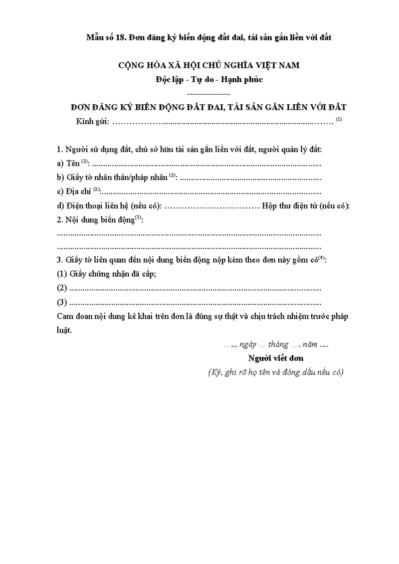 - Đơn đăng ký biến động đất đai theo mẫu do cơ quan có thẩm quyền quy định (ví dụ Mẫu số 18).