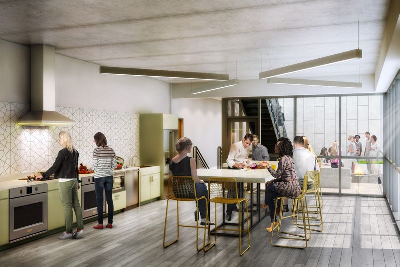 • 1 khu bếp chung 6–8m² có đảo bếp nhỏ và bàn ăn cộng đồng.