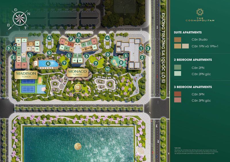 The Cosmopolitan được quy hoạch như một khu phức hợp đô thị hiện đại, kết hợp các chức năng căn hộ cao cấp, thương mại dịch vụ, tiện ích cộng đồng và cảnh quan xanh. Thiết kế tập trung tối ưu hóa tầm nhìn, thông gió và sự tương tác giữa các khối công trình. Mặt bằng tổng thể thể hiện sự phân bổ hợp lý giữa diện tích xây dựng và không gian mở, đảm bảo tỷ lệ cây xanh, sân vườn, lối đi bộ và khu sinh hoạt cộng đồng.