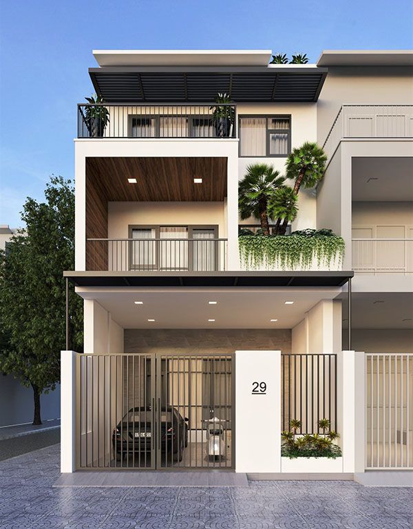Thiết kế mặt tiền cho nhà liền kề 3 mặt thoáng cần cân nhắc tỷ lệ kính – tường, vật liệu ốp, lan can và hệ ban công để đảm bảo thẩm mỹ đồng thời tránh nắng gắt hướng Tây. Ảnh minh họa dưới đây thể hiện một phương án thiết kế mặt tiền hiện đại, tận dụng ban công và cửa kính lớn để lấy sáng và gió.