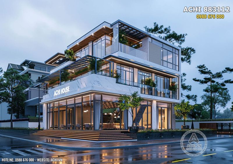 • Hoàn thiện mặt đứng và vật liệu: Vật liệu mặt tiền (gạch ốp, đá, hệ lam nhôm, kính) nên được chọn kỹ để đảm bảo tính thẩm mỹ và tuổi thọ.