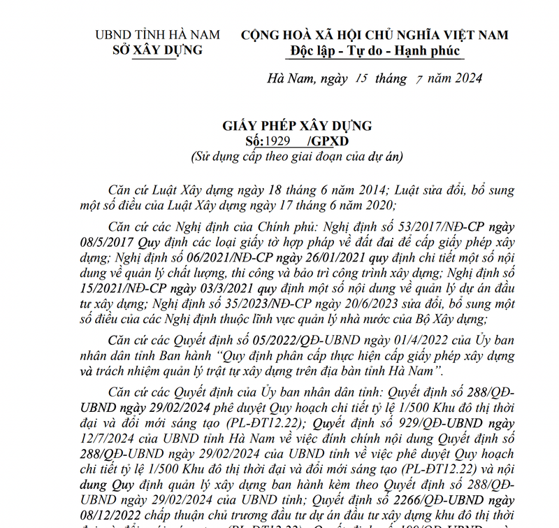 - Giấy phép xây dựng cho hạ tầng chính và các tòa nhà đã, đang hoặc sẽ được thi công.