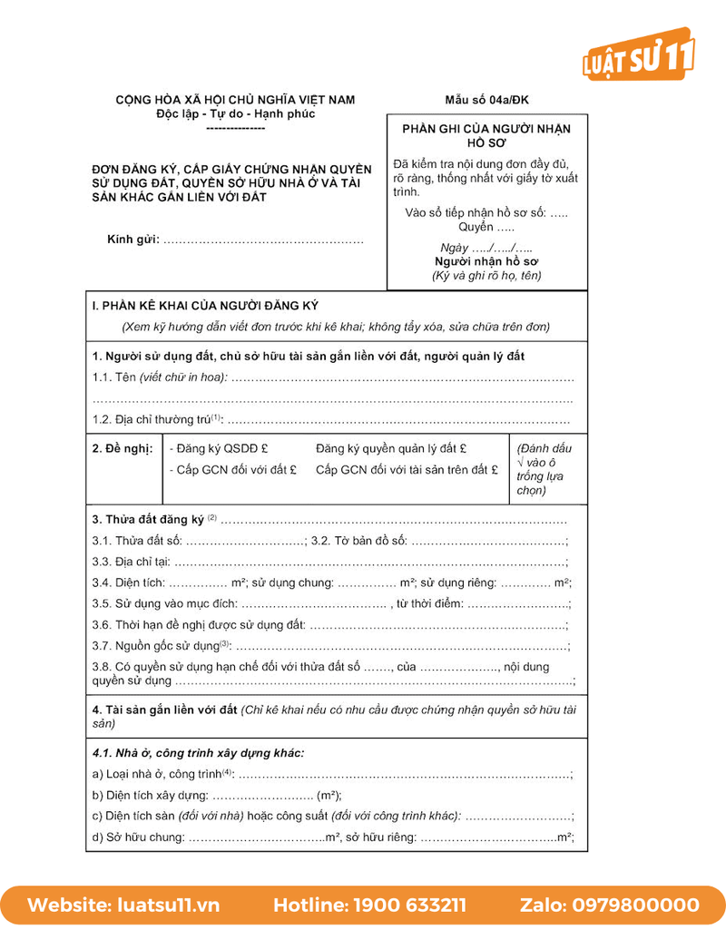 - Đơn đề nghị đăng ký biến động, đơn đề nghị cấp GCN theo mẫu hiện hành.