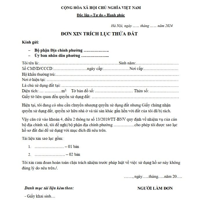 9. Mẫu đơn xin Trích lục quyết định giao đất Sóc Sơn (mẫu tham khảo và hướng dẫn điền)