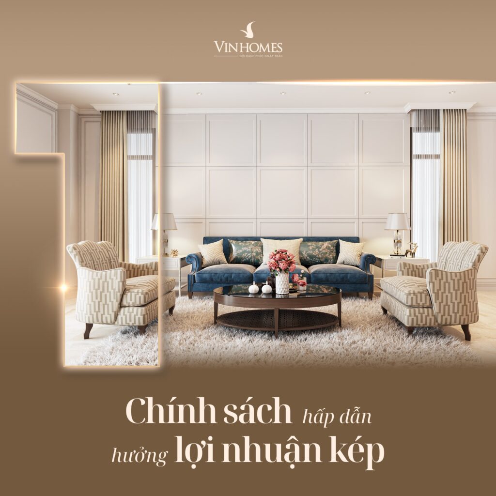 - CHÍNH SÁCH HẤP DẪN TOP ĐẦU THỊ TRƯỜNG: Những chính sách ưu việt liên tục được ra mắt mỗi năm, đặc biệt là CAM KẾT LỢI NHUẬN KÉP – AN TOÀN HƠN TIẾT KIỆM với lợi nhuận tiền thuê tới 18% trong 3 năm dành cho quỹ căn thấp tầng; cùng nhiều chính sách ưu đã và quà tặng ưu việt khác như: mua nhà tặng xe VinFast, chiết khấu tới 12% cho khách về ở sớm, ưu đãi thanh toán sớm, hỗ trợ lãi suất 0%…